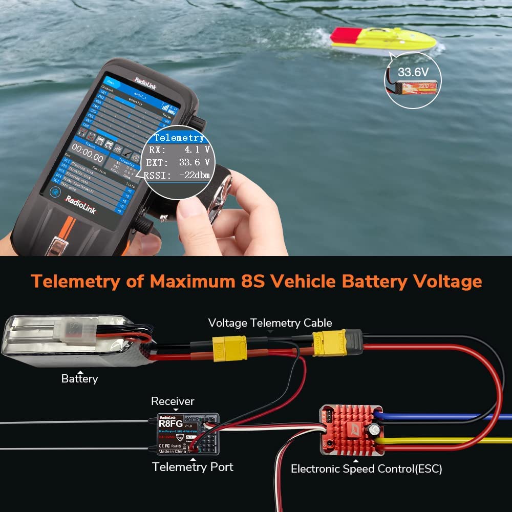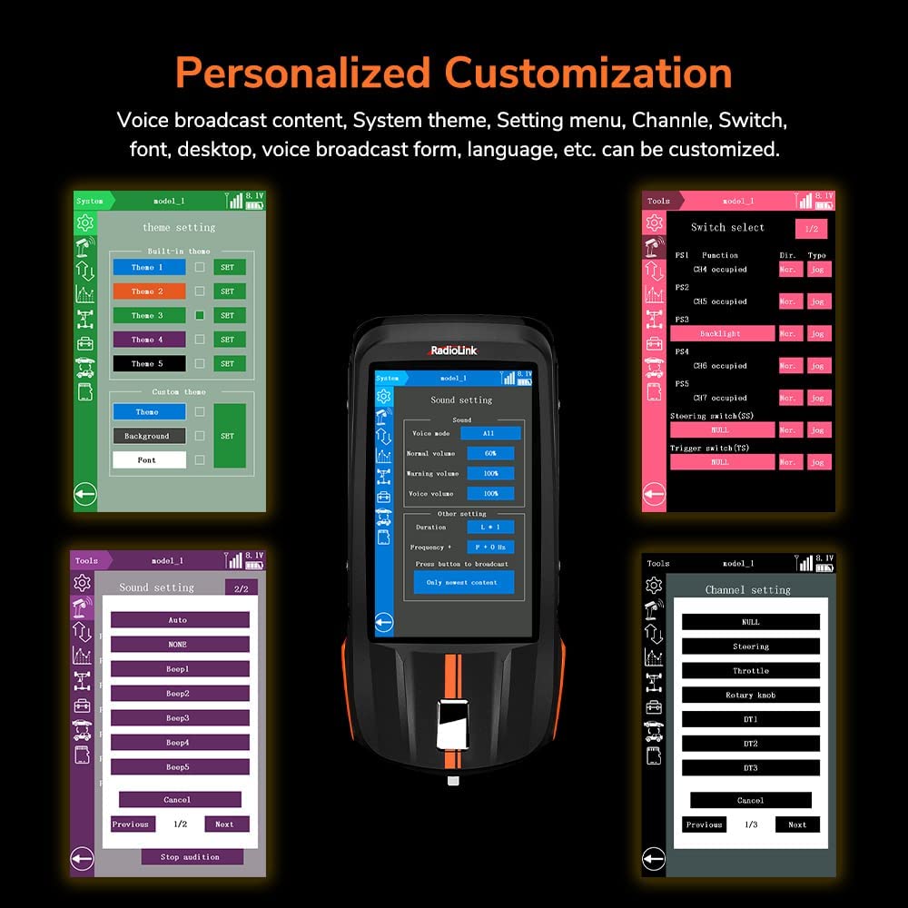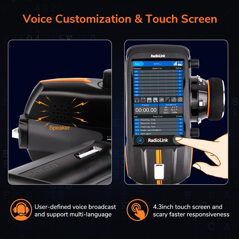 Multifunction & Superior Performance①With pseudo random FHSS algorithm, which makes RC8X with excellent anti-interference ability, control range up to 1900 feet (600 meters).②8 Channels.③Menu interface Customization, Voice customization, Voice Broadcast.④200 Groups Models Storage, 16 Groups ID seed.⑤One Screen, Dual Use.⑥8 Groups Programmable Mix Control. Go and take your RC game to the next level!