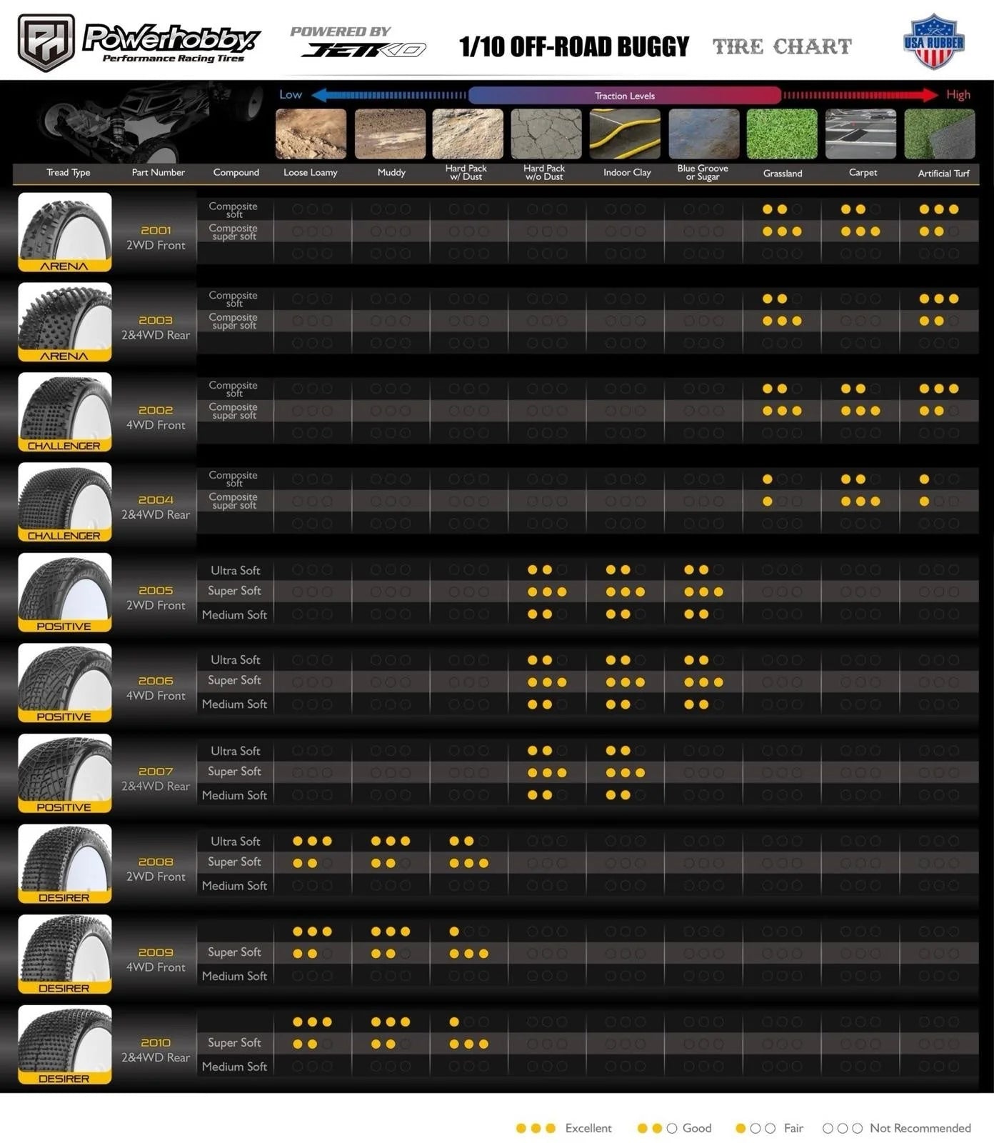 1/10 Desirer buggy tires are designed for maximum forward bite using a lug-style pattern. It's sidewall design reduces edginess found in other race tires. Design comes with exception grip and tread life for a variety of conditions from loose to loam surfaces, to hard packed tracks.