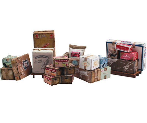 Figure set includes an assortment of colorful, highly detailed crates, boxes, bags and sacks of varying shapes and sizes
