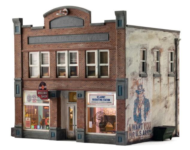 Whether you seek vinyl or valor, this HO scale Built-&-Ready building is the place for you. The structure features eye-catching printed interiors of a record shop, an Army recruiting office and cozy apartments upstairs. Blinds cover the windows above the bustling businesses. It is hand-painted and authentically weathered. There are also exterior details like crates and barrels, as well as decals and signage.