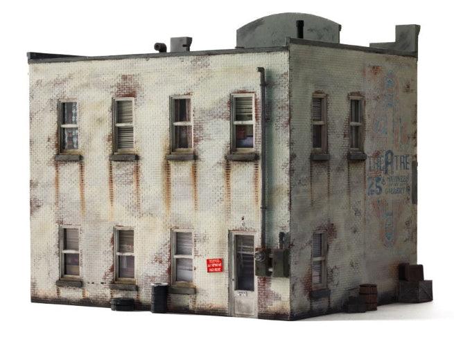 Whether you seek vinyl or valor, this O scale Built-&-Ready building is the place for you. The structure features eye-catching printed interiors of a record shop, an Army recruiting office and cozy apartments upstairs. Blinds cover the windows above the bustling businesses. It is hand-painted and authentically weathered. There are also exterior details like crates and barrels, as well as decals and signage.