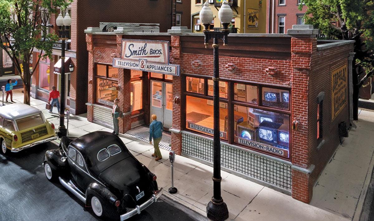 Smith Brothers TV & Appliance carries the newest televisions, refrigerators and more. This 1950s era Built-&-Ready® structure features flickering TVs tuned into the latest programs and a brand, new colored TV on display. Illuminate the store and switch on the TVs with LEDs made for use with the Just Plug® Lighting System. An eye-catching printed interior creates the illusion of depth, from the shop at the front to a stockroom in the back. The building is hand-painted and weathered with loads of signage. Other exterior details like a loading dock with a dolly, a dumpster and more add to the building's authenticity.